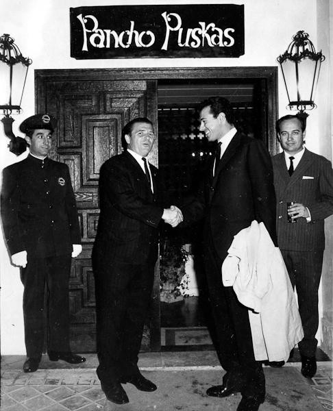 Real Madrid president and chairman, Santiago Bernabéu with Puskás, who took a great everlasting rewarding chance on signing a new star from abroad in 1958 and who became an endearing patron and friend of good natured grace and karma who promptly fired the 2-year tenured head manager, Luis Carniglia for not starting Puskás in the 1959 Champions League Title match despite Puskás' very good ace healthy hale first season form who singly ushered them into the 1958-59 Champions League Title Match in the gripping hard fought third semifinal playoff match with Atlético Madrid with the decisive goal in the 42nd minute on May 13, 1959 to win the semifinal 4-3 on combined goals.