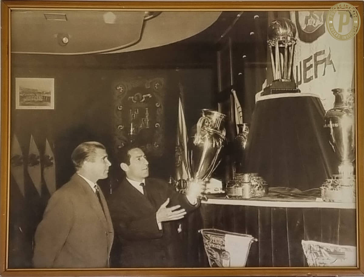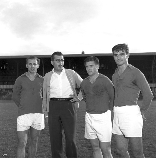 Ferenc Puskás with English pioneering legend Arthur Rowe, manager of Crystal Palace and advocate of the 'push and run' style and Alfredo Di Stéfano in 1962. Arthur Rowe was employed in Hungary as a consultant and a manager in 1938-1940 and also gave a series of lectures on the merits of the 'WM' system.